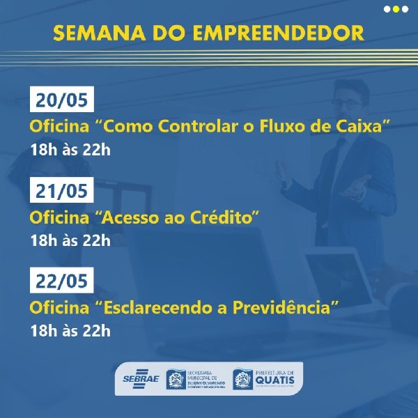 Programação faz parte do calendário anual do “MEI em Movimento”, programa de parceria entre a Prefeitura e o Sebrae Médio ParaíbaComeça no próximo dia 20 e segue até 24 de maio, a Semana do Empreendedor de Quatis. O evento é uma iniciativa da Prefeitura Municipal, que vai ofertar cinco dias de palestras e oficinas empreendedoras totalmente gratuitas. O objetivo é capacitar os empreendedores da cidade com oficinas em diversos temas, como administração, vendas, negócios e mídias digitais. As capacitações terão parceria com o Sebrae Médio Paraíba, através do “MEI em Movimento”. O programa conta com uma programação anual de palestras e oficinas que serão realizadas ao longo do ano na cidade.A Semana do Empreendedor de Quatis será aberta ao público e podem participar munícipes maiores de 18 anos de idade. Os interessados têm até o dia 17 de maio para realizar as inscrições no Centro de Atendimento ao Trabalhador e Empreendedor (CATE), situado na Rua Nossa Senhora do Rosário, nº 185, no Centro, tendo em mãos documentos pessoais como RG e CPF. O local funciona de segunda à sexta, das 8h às 17 horas.Confira as cinco oficinas da Semana do Empreendedor:20/05Oficina “Como Controlar o Fluxo de Caixa”18h às 22h21/05Oficina “Acesso ao Crédito”18h às 22h22/05Oficina “Esclarecendo a Previdência”18h às 22h23/05Oficina “Como Definir o Preço de Venda”18h às 22h24/05Oficina “Mídias Sociais”19h às 21h