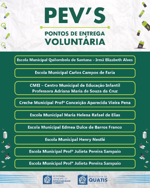 De acordo com a Secretaria de Sustentabilidade e Ambiente, foram instalados 29 PEV's no município, para descarte eletrônicos, pilhas e baterias. Veja na imagem os locais para saber o ponto mais próximo de você!