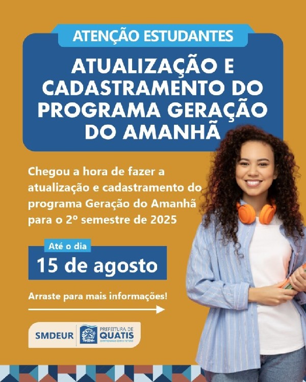 Está chegando a hora de fazer o cadastro e recadastramento do programa Geração do Amanhã para o 2º semestre de 2025. O programa oferece transporte gratuito para alunos do município matriculados em instituições de ensino em outras cidades e que necessitam do transporte para as aulas presenciais.