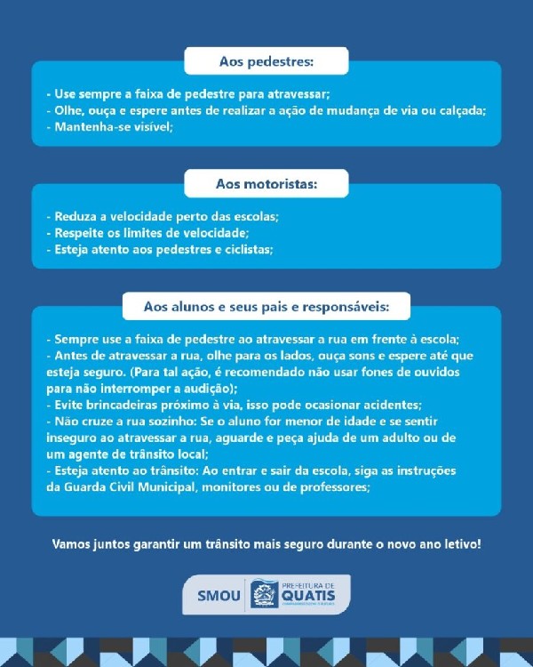 Com a volta às aulas, é hora de relembrar as regras de trânsito para serem adotadas entre pais, alunos e condutores e garantir um trajeto seguro entre a casa e a escola.Pensando nisso, a Prefeitura de Quatis separou algumas das principais dicas para cada agente no trânsito, a fim de garantir maior segurança na cidade neste período de retorno escolar:Aos pedestres:Use sempre a faixa de pedestre para atravessar;Olhe, ouça e espere antes de realizar a ação de mudança de via ou calçada;Mantenha-se visível;Aos motoristas:Reduza a velocidade perto das escolas;Respeite os limites de velocidade;Esteja atento aos pedestres e ciclistas;Aos alunos e seus pais e responsáveis:Sempre use a faixa de pedestre ao atravessar a rua em frente à escola;Antes de atravessar a rua, olhe para os lados, ouça sons e espere até que esteja seguro. (Para tal ação, é recomendado não usar fones de ouvidos para não interromper a audição);Evite brincadeiras próximo à via, isso pode ocasionar acidentes;Não cruze a rua sozinho: Se o aluno for menor de idade e se sentir inseguro ao atravessar a rua, aguarde e peça ajuda de um adulto ou de um agente de trânsito local;Esteja atento ao trânsito: Ao entrar e sair da escola, siga as instruções da Guarda Civil Municipal, monitores ou de professores;Vamos juntos garantir um trânsito mais seguro durante o novo ano letivo!