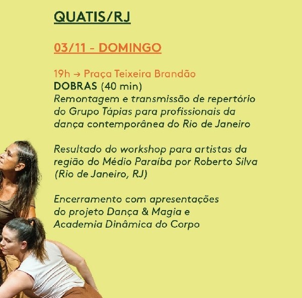 O festival internacional “Dança em Trânsito” chega à cidade de Quatis neste domingo, dia 3 de novembro. O evento começa a partir das 19 horas, na Praça Doutor Teixeira Brandão, no centro da cidade, trazendo diversas apresentações e espetáculos de dança. A iniciativa é uma realização do Espaço Tápias, com patrocínio do Instituto Cultural Vale e Volkswagen, através da Lei de Incentivo à Cultura do Governo Federal, e em parceria com a Prefeitura de Quatis.A entrada é gratuita e livre para todos os públicos.O objetivo do evento é valorizar a dança contemporânea, além de promover e democratizar a expressão artística, percorrendo desde as grandes cidades até as pequenas localidades no interior do Brasil, em teatros ou espaços públicos.Não perca e venha fazer parte!
