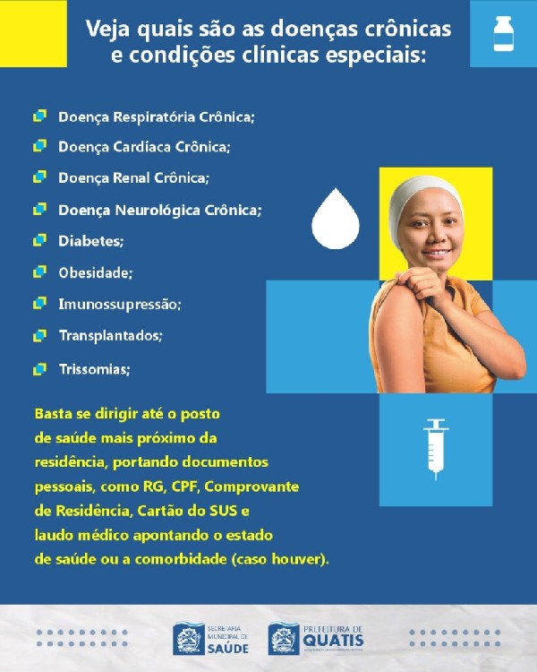 A Prefeitura informa que pacientes que pertencem a grupos com doenças crônicas não transmissíveis e outras condições clínicas, devem apresentar laudo médico.