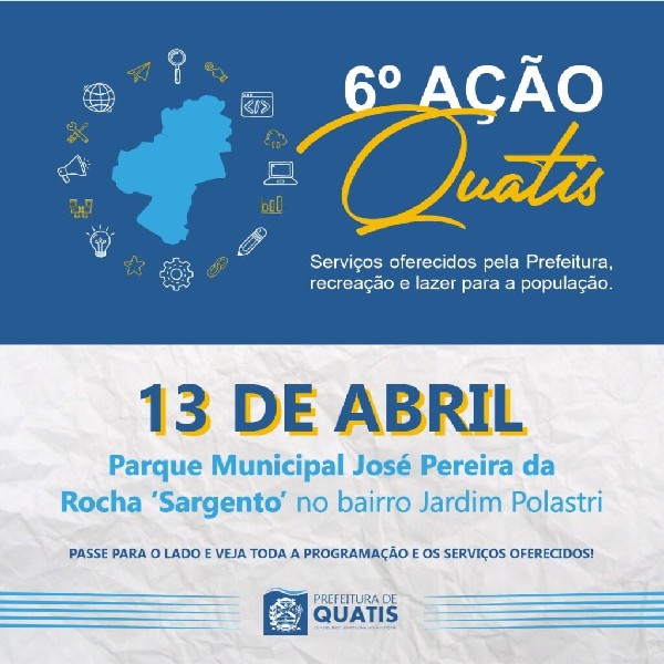 ábado, dia 13, a 6ª edição do ‘Ação Quatis’. Idealizado pela Administração Municipal, o evento tem como objetivo levar os serviços das secretarias municipais para mais perto da população e promover diversas ações gratuitas em espaço público. O ‘Ação Quatis’ vai acontecer das 8h às 12 horas, no Parque Municipal José Pereira da Rocha ‘Sargento’, mais conhecido como Parque da Cidade, no bairro Jardim Polastri. O local contará com uma extensa programação de atividades de recreação, serviços públicos e atendimentos em saúde para a população.