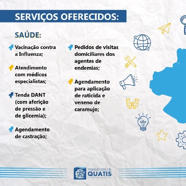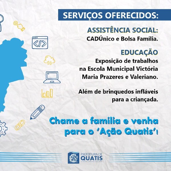 A Prefeitura de Quatis vai realizar neste sábado, dia 13, a 6ª edição do ‘Ação Quatis’. Idealizado pela Administração Municipal, o evento tem como objetivo levar os serviços das secretarias municipais para mais perto da população e promover diversas ações gratuitas em espaço público. O ‘Ação Quatis’ vai acontecer das 8h às 12 horas, no Parque Municipal José Pereira da Rocha ‘Sargento’, mais conhecido como Parque da Cidade, no bairro Jardim Polastri. O local contará com uma extensa programação de atividades de recreação, serviços públicos e atendimentos em saúde para a população.A 6ª edição ainda contará com abertura oficial, a partir das 9 horas, com a presença do prefeito Aluísio d’Elias e autoridades. Neste dia, a Prefeitura também vai realizar a entrega da obra de reforma da Escola Municipal Profª Victória Maria Prazeres e Valeriano, o “Victorinha”, e da Quadra de Esportes Alcindo José Vieira Canil.A Secretaria Municipal de Educação (SME) ainda estará realizando exposição de trabalhos dos alunos da escola. No local, brinquedos infláveis para a criançada também estão garantidos. Confira e saiba mais o que vai ser destaque no dia:Saúde:Vigilância Sanitária:Pedidos de Raticidas, Moluscidas;Ficha de cadastro para castração;Pedidos de visitas domiciliares dos agentes de endemias;Atendimento na Unidade de Saúde do bairro (ESF IV):Vacinação contra a Influenza;Tenda DANT (com aferição de pressão e de glicemia);Consultas com especialistas por agendamento;Consultas com Clínico Geral, livre demanda.Assistência Social:Atendimentos dos programas sociais do Governo Federal (CadÚnico e Bolsa Família)Esporte:Inscrições para o projeto Esporte é Mais Saúde, com apresentações de aulas nas modalidades:Yoga: a partir das 8h30Dança de Salão: a partir das 8h40Balé: a partir das 8h50Atletismo (Corrida e Caminhada): a partir das 9h40Treinamento Funcional: a partir das 9h50Hit Dance e Danças Urbanas: a partir das 10 horasCapoeira: a partir das 10h10