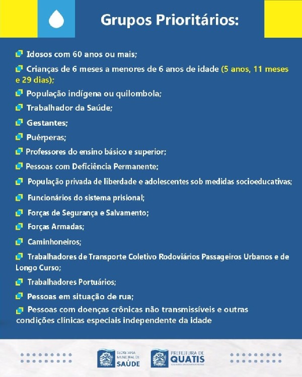 ção contra o vírus da gripe (Influenza) continua. Nesta primeira etapa, estão sendo vacinadas pessoas pertencentes a grupos prioritários ou com comorbidades. Veja na imagem e saiba mais! A campanha segue até o dia 31 de maio.