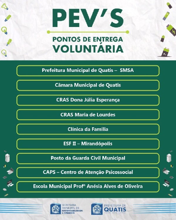 De acordo com a Secretaria de Sustentabilidade e Ambiente, foram instalados 29 PEV's no município, para descarte eletrônicos, pilhas e baterias. Veja na imagem os locais para saber o ponto mais próximo de você!