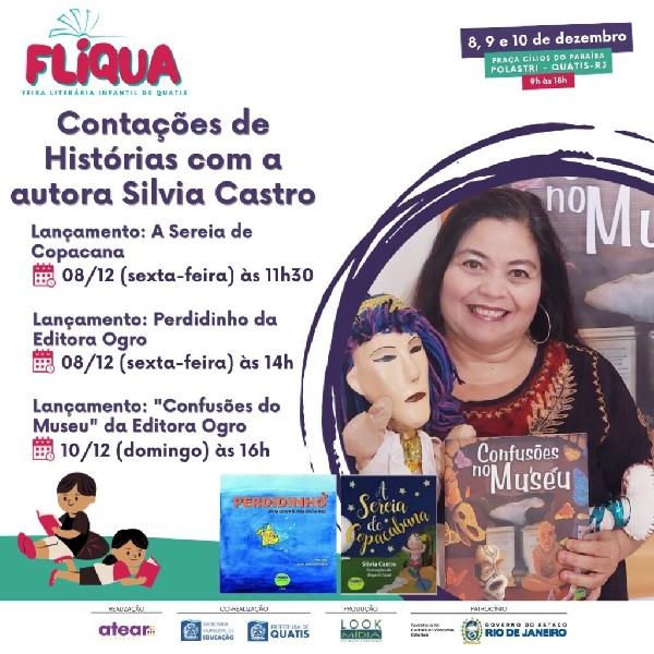 Silvia Castro é atriz, contadora de histórias e educadora. Formada em Letras pela UERJ, pós-graduada em Literatura infanto juvenil pela UCAM, desenvolve atividades diversas nas áreas da leitura e produção de textos há mais de 20 anos. Ganhou moção honrosa na Câmara dos Deputados do RJ, quando foi Supervisora Pedagógica do Projeto Educativo do CCBB. Representou o Brasil em Cuba, México e Colômbia, narrando contos. Publicou seu 1 livro: HISTÓRIAS DE HARMATÃ pela Editora Kimera, em 2019, com grande sucesso. O 2 livro – A SEREIA DE COPACABANA, editado pela editora OGRO traz à cena o protagonismo do meio ambiente, através da personagem que resolve cuidar do lixo que polui a bela praia de Copacabana. O livro esteve em feiras literárias no Rio e fora da cidade. Em novembro de 2021, recebeu destaque no PROJETO PÓLEM na Semana dos Contadores de Histórias, em Santos-SP. Silvia é integrante do MAMI – movimento artístico de música para a infância RJ.Prepare-se para uma experiência literária única nos dias 8, 9 e 10 de dezembro, das 9h às 18h, na Praça Cílios do Paraíba, Jardim Polastri, com entrada gratuita!Programação completa no site www.atearproducoes.com.br/fliqua.