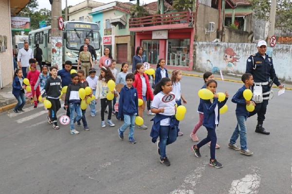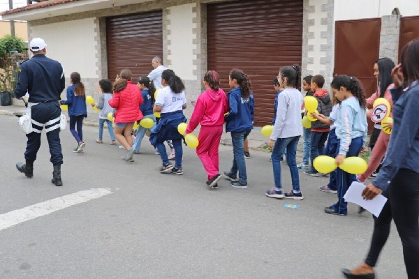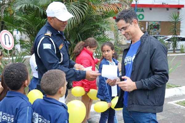 ção, a equipe de Trânsito da Guarda Municipal, junto com os estudantes da escola, realizaram uma caminhada até a Praça Dr. Teixeira Brandão, no centro da cidade, entregando panfletos educativos e orientações aos munícipes que passavam pelo local.