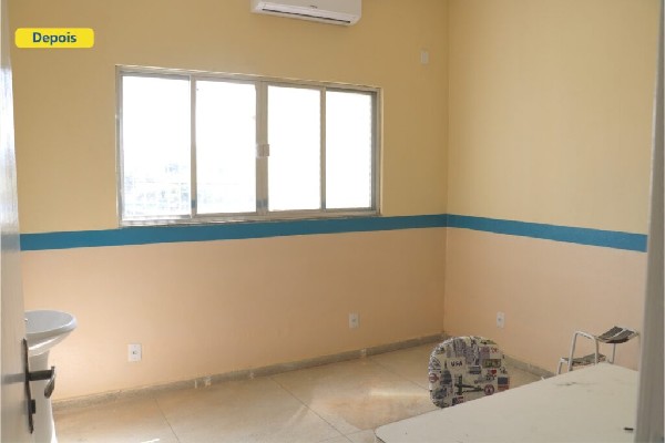 ‘Antes x Depois’ do ESF III, como era e como ficou após a sua revitalização. O local recebeu uma nova pintura, cobertura da área externa, instalação de vários condicionadores de ar, reestruturação elétrica, troca das luminárias e melhor acessibilidade para os pacientes e servidores.