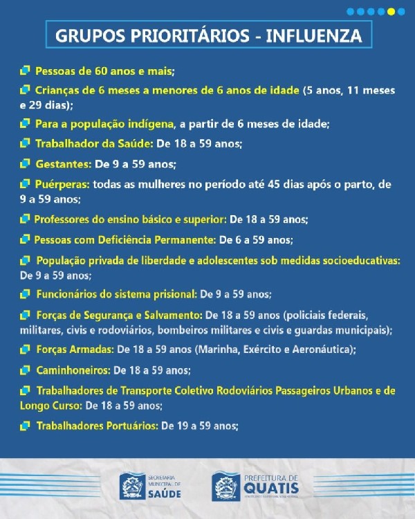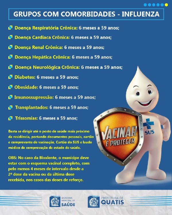 Sabadão também é dia de vacina no braço pra garantir aquela imunidade!A Prefeitura de Quatis vai realizar neste sábado, dia 6 de maio, o Dia D de vacinação contra a gripe (Influenza), e aplicação da vacina bivalente contra a Covid-19 para pessoas com 18 anos ou mais. A vacinação vai ocorrer das 9h às 16 horas em todas as Unidades de Saúde do município e nas Unidades Básicas de Saúde (UBS) dos distritos Falcão e Ribeirão de São Joaquim. Confira na imagem quem poderá se vacinar!Neste dia, as equipes volantes da Secretaria Municipal de Saúde (SMS) também estarão atuando nas áreas rurais para realizar a aplicação da vacina, que inclui Joaquim Leite, estrada Quatis x Floriano até a Fazenda Roma, Fazenda Bom Retiro, Campo Alegre e Morro Grande.Para a vacinação, basta o munícipe se dirigir até o Posto de Saúde mais próximo de sua residência ou na Casa da Criança, em caso da vacinação pediátrica, tendo em mãos documentos pessoais como RG, CPF, Comprovante de Residência, Cartão do SUS e laudo médico apontando o estado de saúde ou a comorbidade (caso houver).Vale lembrar que para a vacinação Bivalente da Covid-19, o munícipe deve estar com pelo menos 4 meses de intervalo desde que recebeu a última dose.Não fique de fora e venha para o Dia D! Vacinas salvam vidas!