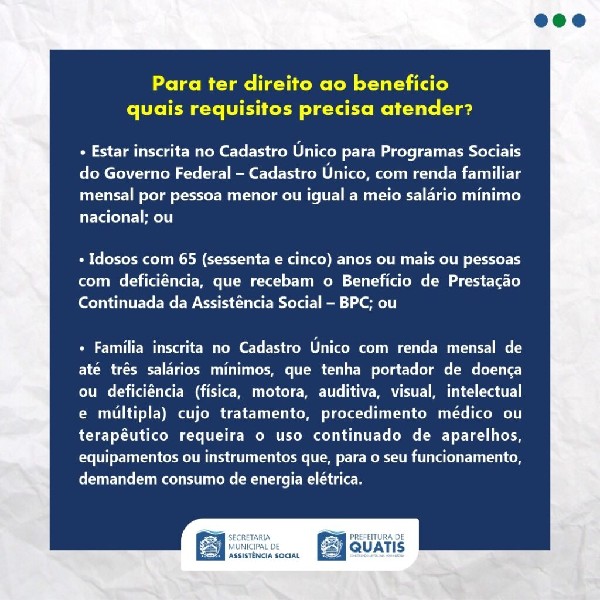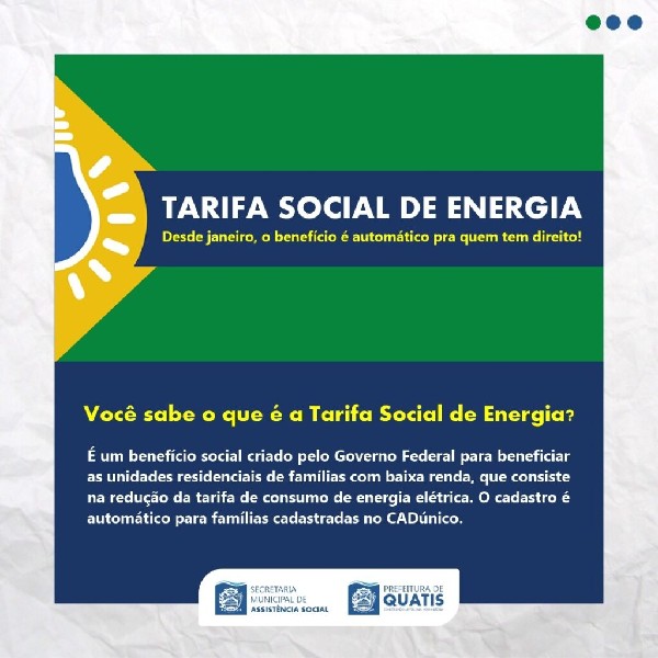 A Prefeitura de Quatis, através da Coordenação do Cadastro Único, vem apresentar o benefício de Tarifa Social de Energia ElétricaO que é a Tarifa Social de Energia?É um benefício social criado pelo Governo Federal para beneficiar as unidades residenciais de famílias com baixa renda, que consiste na redução da tarifa de consumo de energia elétrica. O cadastro é automático para famílias cadastradas no CADúnico.Confira na imagem quais requisitos a família precisa atender para ter direito ao benefício da Tarifa Social de Energia Elétrica e os valores de desconto para cada faixa de consumo por quilowatt por hora (kWh).Para mais informações e para tirar dúvidas sobre o benefício, entre em contato com a Secretaria de Assistência Social, através do ‘ZapSocial’ pelo número (24) 99962-2812 ou pelo telefone (24) 3353-2918.