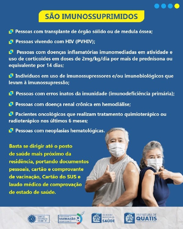 A Prefeitura de Quatis iniciou nesta terça-feira (4) mais uma fase da vacinação bivalente contra a Covid-19, seguindo o Programa Nacional de Imunização (PNI). Agora, pessoas com comorbidades já podem receber a dose da vacina para garantir a proteção contra as variantes Ômicron, BA1, BA4 e BA5. Então, bora vacinar?Para receber a dose bivalente, além de fazer parte de um dos grupos prioritários, o munícipe deve estar com o esquema vacinal completo, com pelo menos 4 meses de intervalo desde a 2ª dose da vacina ou da última dose recebida, nos casos das doses de reforço. Basta se dirigir até o posto de saúde mais próximo da residência, portando documentos pessoais, cartão e comprovante de vacinação, Cartão do SUS e laudo médico de comprovação de alguma comorbidade ou estado de saúde.Passa para o lado e confira nas imagens as comorbidades incluídas nesta etapa!Não deixe de vacinar! Vacinas salvam vidas.
