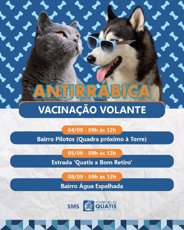 ção Antirrábica segue acontecendo, de forma volante, em Quatis. Neste mês de setembro, a equipe da Divisão de Saúde e Bem-Estar Animal, da Prefeitura de Quatis, vai atender novas localidades do município, a partir desta quinta-feira (4). O serviço, que vai acontecer das 9h ao meio-dia, tem como objetivo imunizar cães e gatos contra a raiva e garantir a proteção animal. A etapa antecede o Dia D da campanha, que acontece no próximo dia 27. Confira as datas e localidades que serão atendidas nos próximos dias: