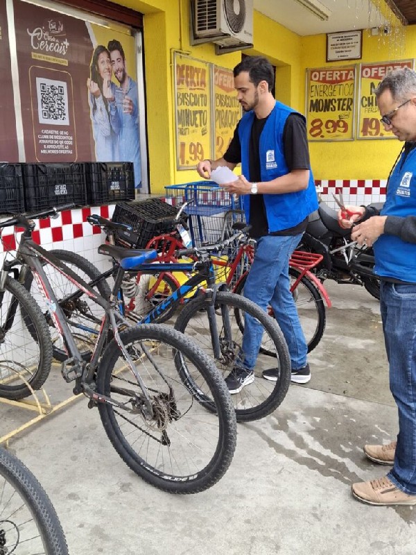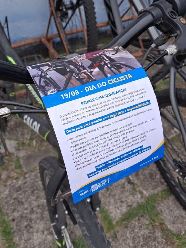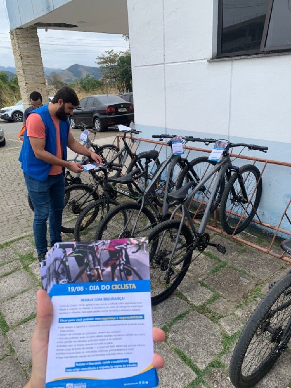 ça-feira (19), para uma ação educativa em alusão ao Dia Nacional do Ciclista. Na ocasião, a equipe disponibilizou panfletos informativos em algumas “bikes” estacionadas em locais públicos e ainda conversou com a população sobre a importância da data, que é comemorada todo ano no dia 19 de agosto. O intuito foi conscientizar ciclistas sobre os cuidados ao conduzir bicicletas. Durante a atividade, o grupo deu dicas e orientações de trânsito, visando a segurança dos amantes do pedal nas vias públicas. O uso de equipamentos de proteção e manutenção preventiva de bicicletas foram um dos tópicos abordados, além do destaque às leis de trânsito e à importância de pedalar em ciclovias.
