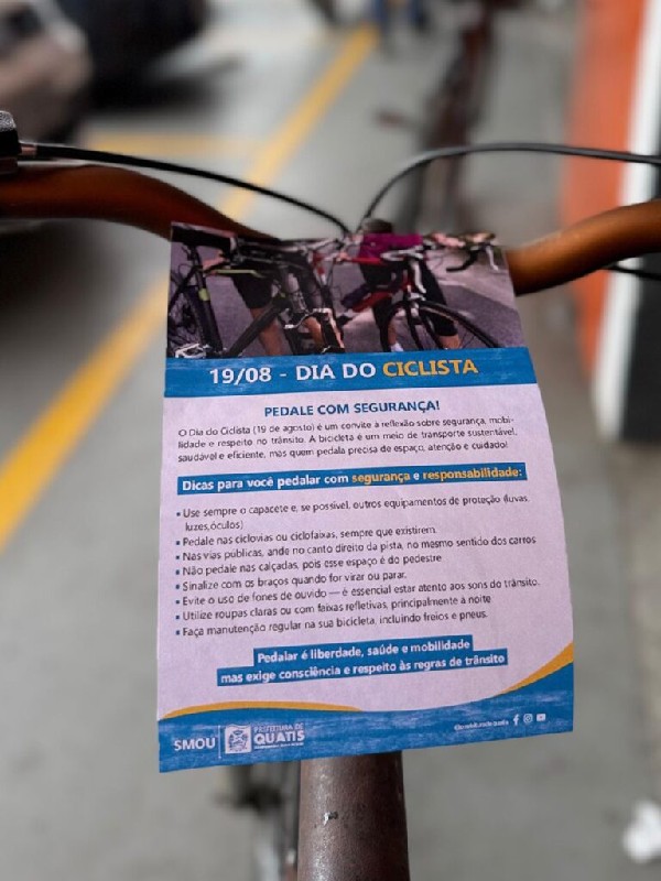 A Secretaria Municipal de Ordem Urbana, da Prefeitura de Quatis, esteve nas ruas da cidade, nesta terça-feira (19), para uma ação educativa em alusão ao Dia Nacional do Ciclista. Na ocasião, a equipe disponibilizou panfletos informativos em algumas “bikes” estacionadas em locais públicos e ainda conversou com a população sobre a importância da data, que é comemorada todo ano no dia 19 de agosto. O intuito foi conscientizar ciclistas sobre os cuidados ao conduzir bicicletas. Durante a atividade, o grupo deu dicas e orientações de trânsito, visando a segurança dos amantes do pedal nas vias públicas. O uso de equipamentos de proteção e manutenção preventiva de bicicletas foram um dos tópicos abordados, além do destaque às leis de trânsito e à importância de pedalar em ciclovias.