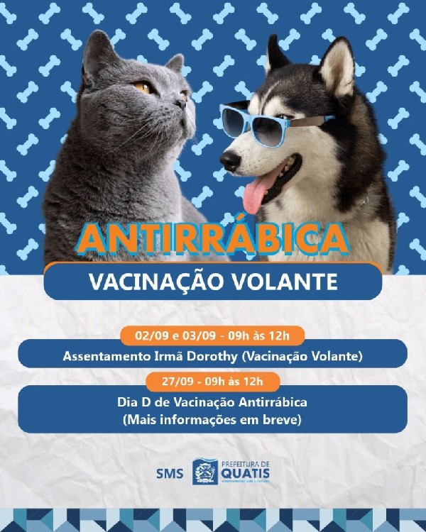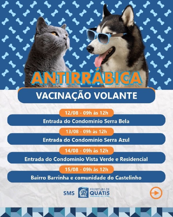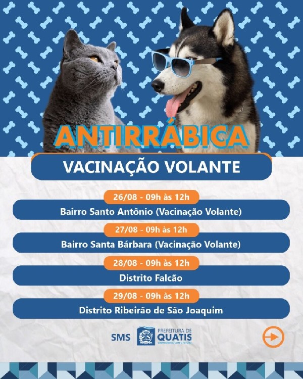 Vai começar a Campanha de Vacinação Antirrábica em Quatis. A partir desta terça-feira (12), a cidade vai dar início à imunização contra a raiva para cães e gatos do município. A ação vai acontecer das 9h às 12 horas em vários bairros e localidades de Quatis, e também de forma volante, de acordo com um calendário da Divisão de Saúde e Bem-Estar Animal, da Secretaria Municipal de Saúde (SMS). Para a vacinação, o tutor do animal deve ter em mãos RG, CPF e comprovante de residência.Confira os dias e locais da vacinação:De 12 a 15 de agosto12/08 (Terça-feira) – Entrada do Condomínio Serra Bela13/08 (Quarta-feira) – Entrada do Condomínio Serra Azul14/08 (Quinta-feira) – Entrada do Condomínio Vista Verde e Residencial15/08 (Sexta-feira) – Bairro Barrinha e comunidade do Castelinho (Pórtico da Cidade)De 19 a 22 de agosto19/08 (Terça-feira) – Bairro Jardim Polastri (Parque da Cidade)20/08 (Quarta-feira) – Bairro Bondarowsky (Pátio da Prefeitura Municipal)21/08 (Quinta-feira) – Loteamentos Céu Azul e São José (Vacinação Volante)22/08 (Sexta-feira) – Bairro Água Espalhada (Vacinação Volante)De 26 a 29 de agosto26/08 (Terça-feira) – Bairro Santo Antônio (Vacinação Volante)27/08 (Quarta-feira) – Bairro Santa Bárbara (Vacinação Volante)28/08 (Quinta-feira) – Distrito Falcão29/08 (Sexta-feira) – Distrito Ribeirão de São JoaquimDias 2, 3 e 27 de setembro02/09 e 03/09 (Terça e Quarta-feira) – Assentamento Irmã Dorothy (Vacinação Volante)27/09 (Sábado) – Dia D de Vacinação Antirrábica (Mais informações em breve)