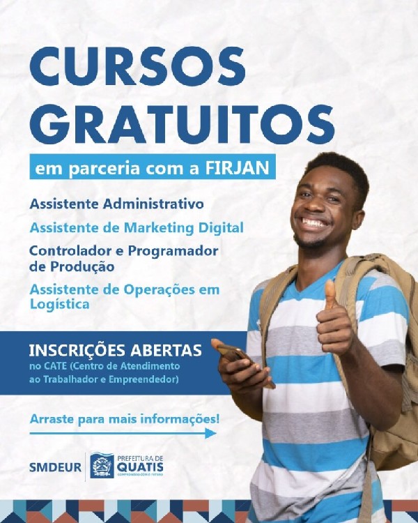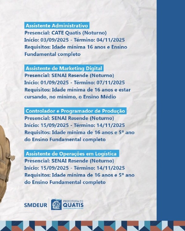 A Prefeitura de Quatis está com inscrições abertas para 4 cursos em parceria com a Federação das Indústrias do Estado do Rio de Janeiro (FIRJAN). As vagas são para assistente administrativo, assistente de Marketing Digital, controlador e programador de Produção e assistente de Operações em Logística. As inscrições já estão acontecendo no Centro de Atendimento ao Trabalhador e Empreendedor – CATE de Quatis. A unidade fica na Rua Nossa Senhora do Rosário, nº 185, no centro da cidade, e funciona de segunda à sexta-feira, das 8h às 17h.Confira os requisitos de cada curso:Assistente AdministrativoPresencial: CATE QuatisInício: 03/09/2025 – Término: 04/11/2025Turno: NoiteRequisitos: Idade mínima 16 anos e Ensino Fundamental completoAssistente de Marketing DigitalPresencial: SENAI ResendeInício: 01/09/2025 – Término: 07/11/2025Turno: NoiteRequisitos: Idade mínima de 16 anos e estar cursando, no mínimo, o Ensino MédioControlador e Programador de ProduçãoPresencial: SENAI ResendeInício: 15/09/2025 – Término: 14/11/2025Turno: NoiteRequisitos: Idade mínima de 16 anos e 5º ano do Ensino Fundamental completoAssistente de Operações em LogísticaPresencial: SENAI ResendeInício: 15/09/2025 – Término: 14/11/2025Turno: NoiteRequisitos: Idade mínima de 16 anos e 5º ano do Ensino Fundamental completo