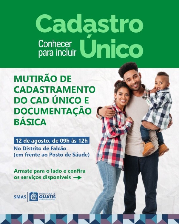 ão de cadastramento do CadÚnico para Programas Sociais está chegando no distrito de Falcão. A ação acontecerá na praça da comunidade, em frente à Unidade Básica de Sáude. O horário de atendimento é das 9h ao meio-dia. O objetivo é garantir o acesso à documentação básica e oferecer informações sobre os programas sociais do Governo Federal para a população, como Cartão Melhor Idade, serviços do CRAS, NADBS, Cadastro Único, Fundação Leão XIII e serviços da Secretaria Municipal de Desenvolvimento Econômico Urbano e Rural.