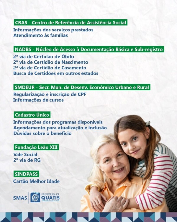 O mutirão de cadastramento do CadÚnico para Programas Sociais está chegando no distrito de Falcão. A ação acontecerá na praça da comunidade, em frente à Unidade Básica de Sáude. O horário de atendimento é das 9h ao meio-dia. O objetivo é garantir o acesso à documentação básica e oferecer informações sobre os programas sociais do Governo Federal para a população, como Cartão Melhor Idade, serviços do CRAS, NADBS, Cadastro Único, Fundação Leão XIII e serviços da Secretaria Municipal de Desenvolvimento Econômico Urbano e Rural.Confira:CRASInformações dos serviços ofertadosAtendimento às famíliasCadastro Único (CadÚnico)Informações dos programas disponíveis para a populaçãoAgendamento para atualização e inclusão no CadÚnicoDúvidas sobre benefícioNúcleo de Acesso à Documentação Básica e Sub-Registro (NADBS)2ª via de certidão de óbito2ª via de certidão de nascimento2ª via de certidão de casamentoBusca de certidões em outros estadosSecretaria de Desenvolvimento Econômico Urbano e RuralRegularização e inscrição de CPFInformações de cursosFundação Leão XIIIVale Social2ª via de RGSINDPASSCartão Melhor IdadeO Mutirão de Acesso à Documentação Básica acontecerá até setembro, em diversas localidades do município de Quatis. As datas e os locais das próximas ações serão divulgadas em breve.