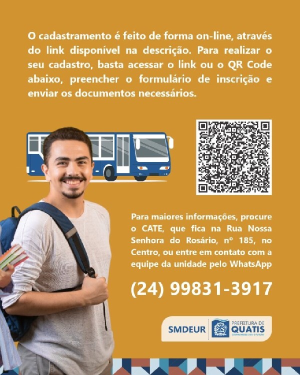 Se você é morador de Quatis e estudante de Ensino Superior, Técnico ou Profissionalizante nas instituições de cidades vizinhas, não perca tempo e garanta já o seu direito ao transporte gratuito. Venha e se inscreva no programa Geração do Amanhã!