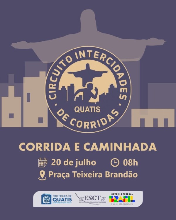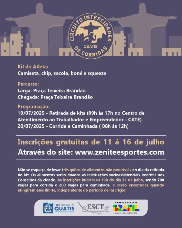 Prepare-se para entrar neste desafio No próximo domingo, dia 20 de julho, o município de Quatis vai sediar o Circuito Intercidades de Corridas, uma iniciativa da Instituição Espaço Social Cidadania para Todos (ESCT), em parceria com a Prefeitura de Quatis.A concentração será às 7h30, na Praça Dr. Teixeira Brandão, no centro de Quatis. Haverá uma corrida de 7 km e uma caminhada de 3 km, com previsão de saída às 8h, em direção à estrada ‘Quatis x Vista Alegre’.E, atenção: as inscrições abrem nesta sexta-feira, dia 11, a partir das 19 horas, e podem ser feitas pelo site www.zeniteesportes.com . O período de inscrição segue até a próxima quarta-feira (16).São 700 vagas para a corrida e 200 vagas para a caminhada. As inscrições serão encerradas quando atingirem o limite de vagas. Então, corra, e garanta já a sua!Haverá entrega de Kit Atleta, com camiseta personalizada, chip de cronometragem, sacola, boné e squeeze, que pode ser retirado no dia anterior ao evento, no sábado (19), das 9h às 17h, no Centro de Atendimento ao Trabalhador e Empreendedor (CATE) de Quatis. O local fica na Rua Nossa Senhora do Rosário, nº 185, no centro da cidade.A participação é gratuita, mas os participantes podem contribuir com a doação de 3 kg de alimentos não perecíveis no dia da retirada do kit atleta. Os itens arrecadados serão doados para as instituições Socioassistenciais inscritas nos Conselhos da Cidade.Confira mais informações no site das inscrições: https://www.zeniteesportes.com/Venha para o Circuito Intercidades e abrace essa iniciativa esportiva na cidade de Quatis!
