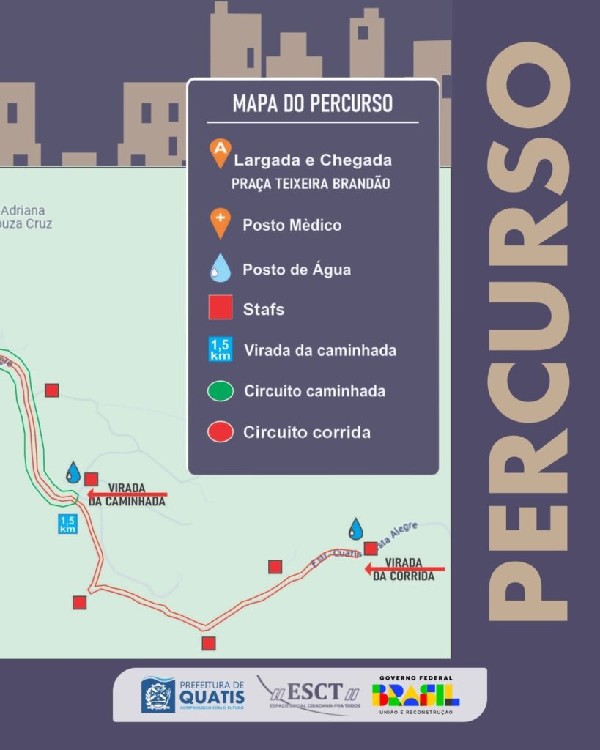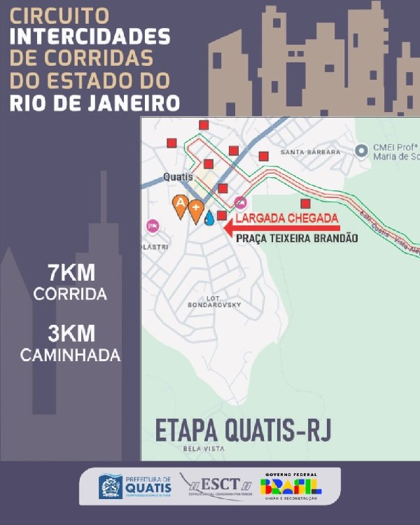 ção seráàs 7h30, na Praça Dr. Teixeira Brandão, no centro de Quatis. Haverá uma corrida de 7 km e uma caminhada de 3 km, com previsão de saída às 8h, em direção à estrada ‘Quatis x Vista Alegre’.