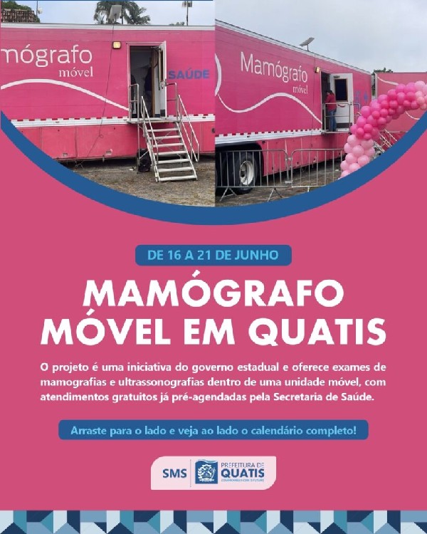 és de uma parceria com a Secretaria de Estado de Saúde do Rio de Janeiro (SES-RJ), o município de Quatis vai receber, na próxima semana, o Mamógrafo Móvel. O projeto, que é uma iniciativa do governo estadual, oferece exames de mamografias e ultrassonografias dentro de uma unidade móvel. O intuito é dar assistência em saúde e bem-estar para a população feminina, com a detecção precoce do câncer de mama. O Mamógrafo Móvel estará na Praça Getúlio Vargas (Praça da Matriz), no centro de Quatis, a partir de segunda-feira, dia 16. A unidade ficará instalada até sábado (21), com diversas consultas gratuitas já pré-agendadas pela Secretaria de Saúde do município.
