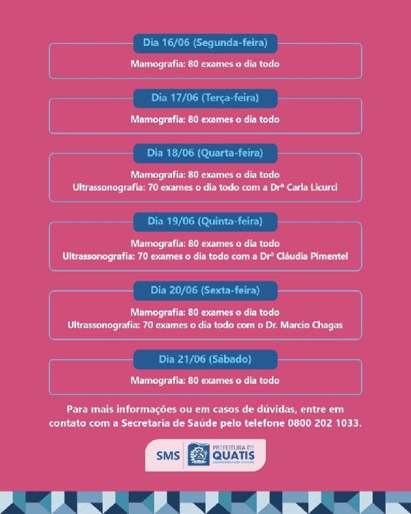 Através de uma parceria com a Secretaria de Estado de Saúde do Rio de Janeiro (SES-RJ), o município de Quatis vai receber, na próxima semana, o Mamógrafo Móvel. O projeto, que é uma iniciativa do governo estadual, oferece exames de mamografias e ultrassonografias dentro de uma unidade móvel. O intuito é dar assistência em saúde e bem-estar para a população feminina, com a detecção precoce do câncer de mama. O Mamógrafo Móvel estará na Praça Getúlio Vargas (Praça da Matriz), no centro de Quatis, a partir de segunda-feira, dia 16. A unidade ficará instalada até sábado (21), com diversas consultas gratuitas já pré-agendadas pela Secretaria de Saúde do município.De acordo com um calendário de atendimentos, a unidade móvel vai ofertar, por dia, cerca de 80 exames em mamografia e 70 exames em ultrassonografia, entre tireoide, tireoide com doppler, mamária, pélvica, transvaginal e transvaginal com doppler.Veja o calendário de atendimentos do Mamógrafo Móvel em Quatis:Dia 16/06 (Segunda-feira)Mamografia: 80 exames o dia todoDia 17/06 (Terça-feira)Mamografia: 80 exames o dia todoDia 18/06 (Quarta-feira)Mamografia: 80 exames o dia todoUltrassonografia: 70 exames o dia todo com a Drª Carla LicurciDia 19/06 (Quinta-feira)Mamografia: 80 exames o dia todoUltrassonografia: 70 exames o dia todo com a Drª Cláudia PimentelDia 20/06 (Sexta-feira)Mamografia: 80 exames o dia todoUltrassonografia: 70 exames o dia todo com o Dr. Marcio ChagasDia 21/06 (Sábado)Mamografia: 80 exames o dia todo
