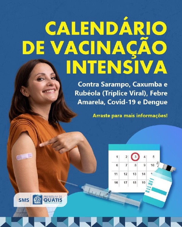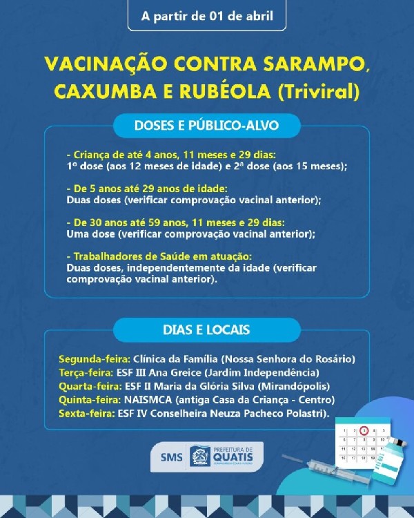 A Prefeitura de Quatis vai dar início, na próxima terça-feira (1º), à nova campanha de vacinação contra doenças virais. O objetivo, segundo a Secretaria Municipal de Saúde (SMS), é intensificar a imunização de toda população e cumprir com o esquema de vacinação na cidade. Os imunizantes disponíveis incluem a Tríplice Viral, que protege contra Sarampo, Caxumba e Rubéola, além de imunizantes contra outras endemias, como Febre Amarela, Covid-19 e Dengue.A ação acontecerá em todas as unidades de Estratégia da Saúde da Família (ESF’s) de Quatis, de acordo com um calendário com dias e locais para cada etapa de vacinação, que também terá um público-alvo específico. Para se vacinar, o munícipe deve comparecer à unidade mais próxima, tendo em mãos cartão do SUS e caderneta de vacinação. O ato de imunização acontece das 9h às 16 horas.Confira o calendário completo e o público-alvo de cada vacinação:VACINAÇÃO CONTRA SARAMPO, CAXUMBA E RUBÉOLA (Triviral)Público-Alvo:Criança de até 4 anos, 11 meses e 29 dias: 1º dose (aos 12 meses de idade) e 2ª dose (aos 15 meses);De 5 anos até 29 anos de idade – duas doses (verificar comprovação vacinal anterior);De 30 anos até 59 anos, 11 meses e 29 dias – uma dose (verificar comprovação vacinal anterior);Trabalhadores de Saúde em atuação: duas doses, independentemente da idade (verificar comprovação vacinal anterior).Dias e Locais de Vacinação:Segunda-feira: Clínica da Família, bairro Nossa Senhora do Rosário;Terça-feira: ESF III Ana Greice, bairro Jardim Independência;Quarta-feira: ESF II Maria da Glória Silva, bairro Mirandópolis;Quinta-feira: NAISMCA (antiga Casa da Criança), no Centro;Sexta-feira: ESF IV Conselheira Neuza Pacheco, bairro Jardim Polastri.VACINAÇÃO CONTRA A FEBRE AMARELAPúblico-alvo:População de 9 meses a 59 anos não vacinados.Dias e Locais de Vacinação:Segunda-feira: Clínica da Família, bairro Nossa Senhora do Rosário;Terça-feira: NAISMCA (antiga Casa da Criança), no Centro;Quarta-feira: ESF II Maria da Glória Silva, bairro Mirandópolis;Quinta-feira: ESF III Ana Greice, bairro Jardim Independência;Sexta-feira: ESF IV Conselheira Neuza Pacheco, bairro Jardim Polastri.VACINAÇÃO CONTRA A COVID-19Público-alvo:Crianças de 6 meses a menores de 5 anos de idade;Gestantes (1 dose a cada gestação);Pessoas com 60 anos ou mais de idade e pessoas imunocomprometidas (1 dose a cada 6 meses com esquema completo);1 dose a cada 12 meses para grupos em caráter especial – adolescentes e jovens em medida socioeducativa, funcionário do sistema de privação de liberdade, indígenas vivendo ou não em terra indígenas, pessoas vivendo em longa permanência, pessoas com deficiência permanente, pessoas privadas de liberdade, ribeirinhos e quilombolas, pessoas em situação de rua e trabalhadores de saúde.Dias e Locais de Vacinação:Segunda e Quarta-feira:Clínica da Família, bairro Nossa Senhora do Rosário;NAISMCA (antiga Casa da Criança), no Centro;ESF IV Conselheira Neuza Pacheco, bairro Jardim Polastri.Terça e Quinta-feira:ESF II Maria da Glória Silva, bairro Mirandópolis;ESF III Ana Greice, bairro Jardim Independência;VACINAÇÃO CONTRA A DENGUE:Público-alvo:Crianças e adolescentes de 6 a 16 anos.Dia e Local de Vacinação:Todas as quartas-feiras, no Hospital São Lucas – Centro.
