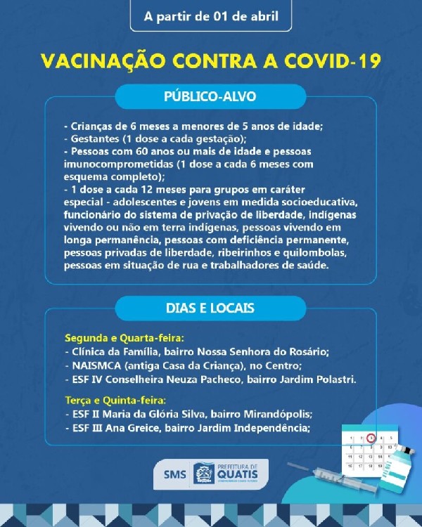 ção acontecerá em todas as unidades de Estratégia da Saúde da Família (ESF’s) de Quatis, de acordo com um calendário com dias e locais para cada etapa de vacinação, que também terá um público-alvo específico. Para se vacinar, o munícipe deve comparecer à unidade mais próxima, tendo em mãos cartão do SUS e caderneta de vacinação. O ato de imunização acontece das 9h às 16 horas.