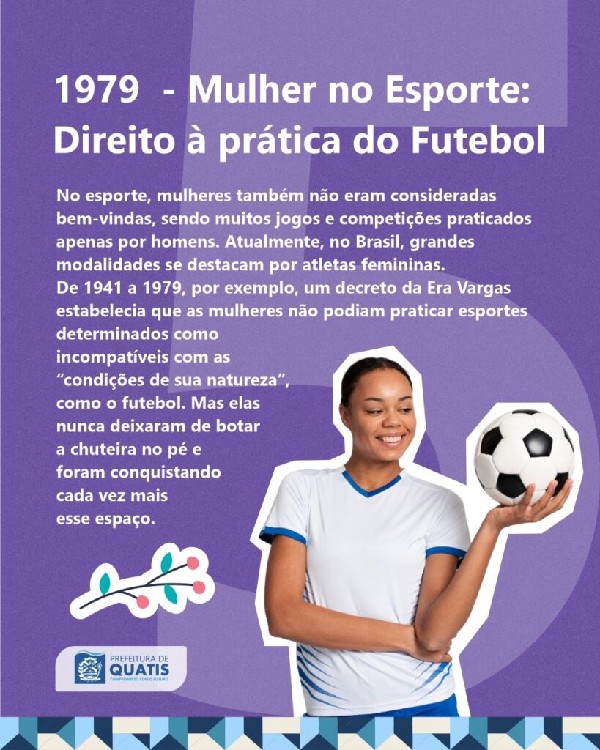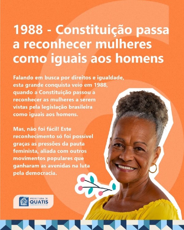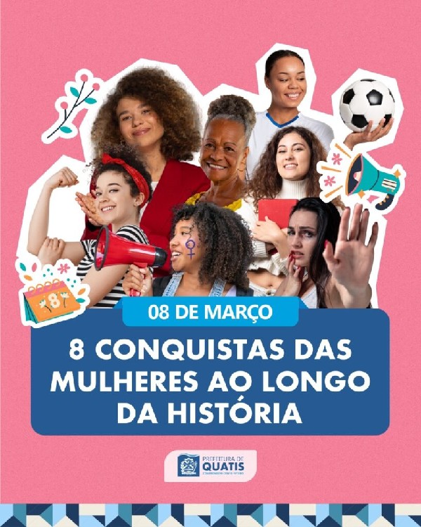 ábado, dia 8 de Março, o Dia Internacional da Mulher, e a Prefeitura de Quatis separou 8 grandes fatos históricos que marcaram a luta e a conquista das mulheres ao longo dos anos no Brasil para relembrarmos a importância desta data em todo o mundo.