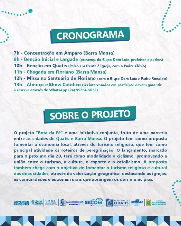 O “Rota da Fé”, projeto de turismo religioso de iniciativa entre as prefeituras de Quatis e de Barra Mansa, já tem data de lançamento. O evento de parceria entre as duas cidades está marcado para acontecer no dia 20 de novembro e será realizado por meio de um passeio ciclístico, que vai unir esporte, aventura e devoção entre fiéis. O lançamento do projeto contará com um percurso passando entre Nossa Senhora do Amparo, Quatis e Floriano. Ao todo, são 400 vagas por município e a participação é gratuita. As inscrições abrem nesta sexta-feira (7) e os interessados em participar devem se inscrever pelo link https://l1nk.dev/SAw1oA concentração para o passeio ciclístico acontece a partir das 7 horas da manhã, com largada às 8h, no distrito de Amparo, em Barra Mansa. A programação reunirá diversas atividades culturais e religiosas durante a rota, com direito a 3 paradas em fazendas e comunidades, apresentação de coral, cerimônia religiosa, show católico e entre outras.VEJA MAIS:Lançamento Rota da Fé20 de novembro de 20257h – Concentração em Amparo (Barra Mansa)8h – Bênção Inicial e Largada oficial (presença do Bispo Dom Luiz, prefeitos e padres)10h – Bênção em Quatis (Palco em frente à Igreja, com o Padre Clésio)11h – Chegada em Floriano (Barra Mansa)12h – Missa no Santuário de Floriano (com o Bispo Dom Luiz e Padre Ronaldo)13h – Almoço e Show Católico (*Os interessados em participar devem garantir a reserva através do WhatsApp (24) 99264-5055.)SOBRE O PROJETO “ROTA DA FÉ”O projeto “Rota da Fé” é uma iniciativa conjunta, fruto de uma parceria entre as cidades de Quatis e Barra Mansa. O projeto tem como proposta fomentar a economia local, através do turismo religioso, que tem como principal atividade os roteiros de peregrinação. O lançamento, marcado para o próximo dia 20, terá como modalidade o ciclismo, promovendo a união entre o turismo, a cultura, o esporte e o catolicismo. A proposta também chega com o objetivo de fomentar o turismo religioso e cultural das duas cidades, através da valorização geográfica, destacando as igrejas, as comunidades e as zonas rurais que abrangem os dois municípios.