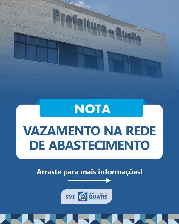 A Prefeitura Municipal de Quatis informa que foi localizado um vazamento de grande proporção na rede de abastecimento de água. O problema já foi sanado pela equipe da Secretaria Municipal de Infraestrutura, mas devido à situação, os níveis dos reservatórios foram impactados significativamente, causando falta d'e1gua em algumas localidades do município.A PMQ também esclarece que devido a alta demanda de solicitações do Caminhão Pipa, os atendimentos estão com uma demora fora da normalidade para serem realizados e a equipe está trabalhando para atender a todos os pedidos agendados.Pedimos a colaboração daqueles que não foram afetados para economizarem água visando acelerar a recuperação dos reservatórios e restabelecer o sistema de abastecimento de forma plena no menor tempo possível.Para suporte, como solicitação de atendimento do Caminhão Pipa, entre em contato pelo telefone (24) 99253-0376. Para outras informações ou dúvidas, estamos disponíveis pelo número 0800 202 1033.A Prefeitura de Quatis lamenta o transtorno sofrido por parte da população e agradece desde já a compreensão e cooperação de todos.