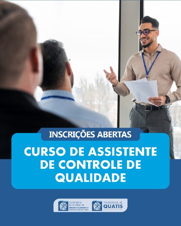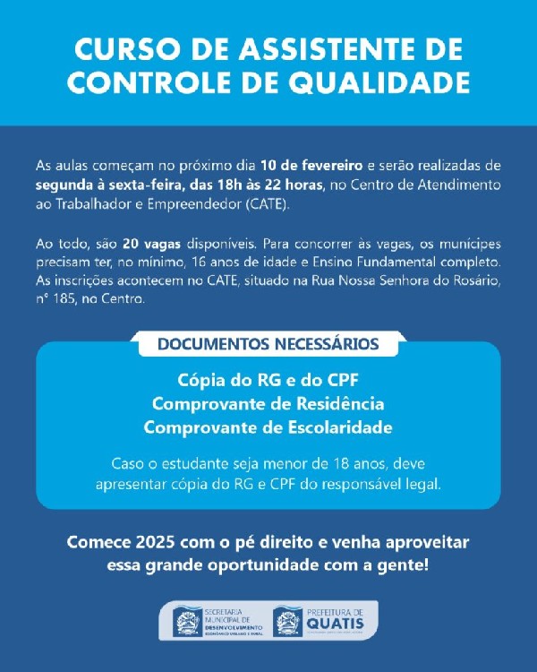 á com inscrições abertas para o curso de Assistente de Controle de Qualidade. A capacitação, que é totalmente gratuita, é uma parceria entre a administração municipal e o Serviço Nacional de Aprendizagem Industrial (Firjan SENAI). Ao todo, são 20 vagas disponíveis e as inscrições acontecem no Centro de Atendimento ao Trabalhador e Empreendedor (CATE) de Quatis. Para concorrer às vagas, os munícipes precisam ter, no mínimo, 16 anos de idade e Ensino Fundamental completo. Os documentos necessários para a matrícula do curso incluem cópia do RG, CPF, comprovante de residência e comprovante de escolaridade. Caso o estudante seja menor de 18 anos, deve apresentar cópia do RG e CPF do responsável legal. As aulas começam no próximo dia 10 de fevereiro e serão realizadas de segunda à sexta-feira, das 18h às 22 horas, no CATE. A unidade fica na Rua Nossa Senhora do Rosário, n° 185, no centro da cidade.