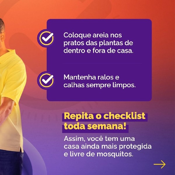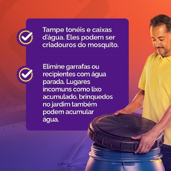 ◊ Esvazie garrafas, potes e vasos com água e vire-os para baixo; ◊ Mantenha caixas d'e1gua, toneis e outros reservatórios de água sempre limpos e bem tampados; ◊ Descarte garrafas pet e embalagens vazias de forma adequada; ◊ Amarre bem os sacos de lixo e coloque para coleta nos dias certos; ◊ Limpe as calhas e lajes regularmente; ◊ Coloque areia nos pratos das plantas; ◊ Guarde pneus em locais fechados ou descarte em borracharias; ◊ Não esqueça de verificar equipamentos como os reservatórios das geladeiras que podem acumular água.