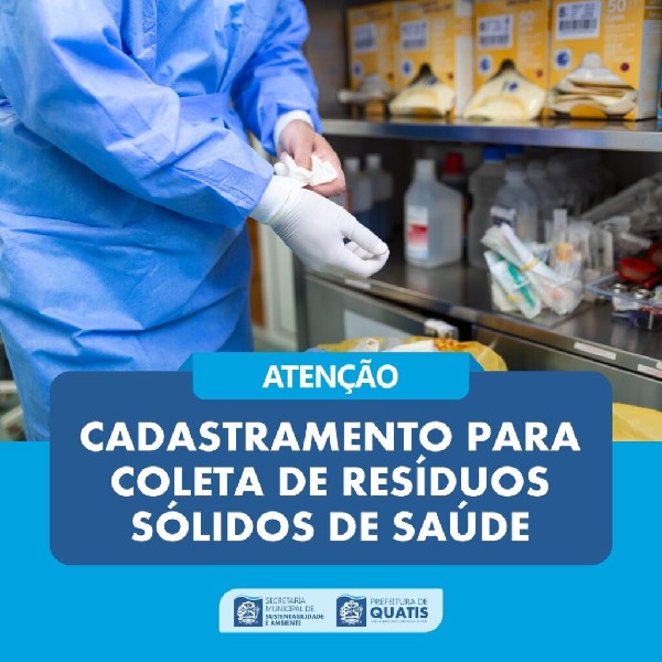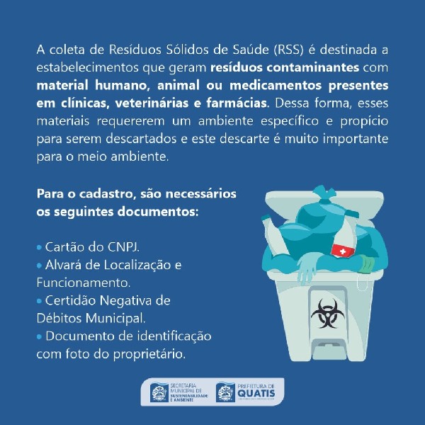 Já sabe o que são os RSS? Então já fique ligado e saiba mais como funciona!A coleta de Resíduos Sólidos de Saúde (RSS) é destinada a estabelecimentos que geram resíduos contaminantes com material humano, animal ou medicamentos presentes em clínicas, veterinárias e farmácias. Dessa forma, esses materiais requererem um ambiente específico e propício para serem descartados e este descarte é muito importante para o meio ambiente.Para que a Secretaria Municipal de Sustentabilidade e Ambiente (SMSA) tenha controle dos pontos de coleta, é necessário que trabalhadores da área, que precisam realizar este tipo de descarte, os chamados de geradores de Resíduos Sólidos de Saúde (RSS), façam o cadastro.O cadastramento para geradores de RSS pode ser realizado na Secretaria Municipal de Sustentabilidade e Ambiente (SMSA), localizada no prédio da Prefeitura de Quatis.Para o cadastro, são necessários os seguintes documentos:Cartão do CNPJ.Alvará de Localização e Funcionamento.Certidão Negativa de Débitos Municipal.Documento de identificação com foto do proprietário.Aos munícipes que também tem a necessidade de descartar seus RSS, podem estar encaminhando à Unidade de Saúde mais próxima de sua residência, onde são coletados materiais e outros resíduos como:Agulhas usadas (teste de glicose, insulina, aplicações veterinárias, etc.).Medicamentos vencidos.Navalhas usadas.Para mais informações, entre em contato com a Secretaria de Sustentabilidade e Ambiente pelo telefone 0800 202 1033.