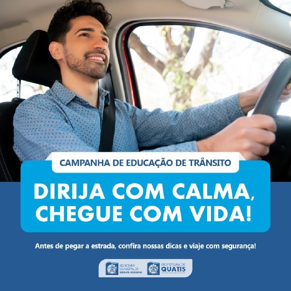 A Prefeitura de Quatis inicia agora uma nova Campanha de Educação de Trânsito. O assunto da vez é viagens e direção defensiva.Sabemos que janeiro é conhecido como um mês mais atrativo entre os turistas para se viajar, devido às férias de verão e início de ano. Por isso, para se ter um passeio com segurança, é necessário redobrar a atenção no trânsito durante a viagem.Pensando nisso, separamos algumas dicas para você adotar nesta época de viagens e garantir a sua segurança e a de sua família no trânsito:Verifique a manutenção do veículo;Certifique-se de que freios, pneus e suspensão estão em boas condições;Respeite os limites de velocidade e condições climáticas;Mantenha distância segura dos outros veículos;Evite dirigir cansado ou sob efeito de álcool;Use cinto de segurança e garantam que todos os passageiros o façam;Seja cauteloso em curvas e cruzamentos;Mantenha os farois acesos durante o dia e à noite;E lembre-se: dirija sempre com calma, atenção e prudência, e chegue com vida! Tenha uma boa viagem!