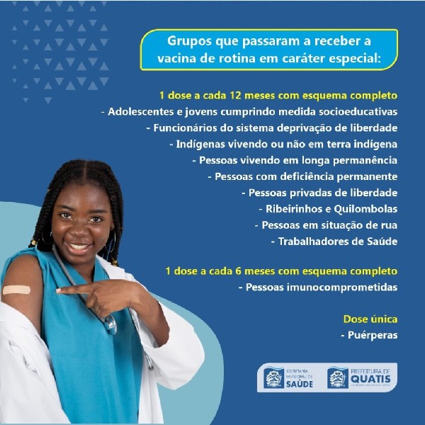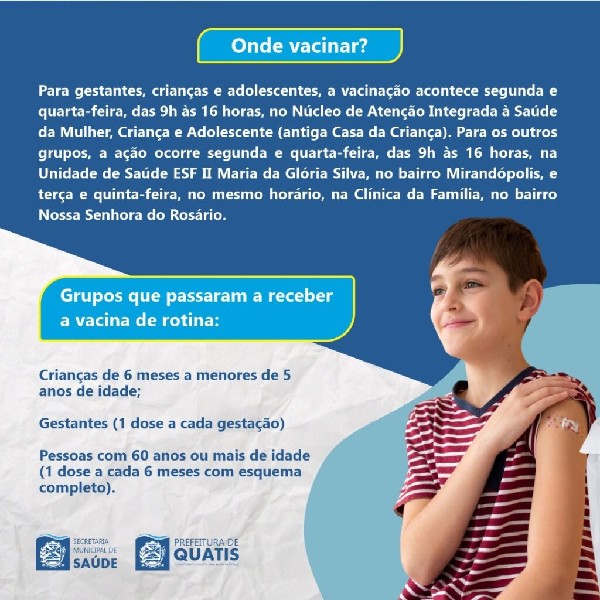 A Prefeitura de Quatis ampliou os grupos prioritários que passaram a receber a vacina contra a Covid-19 em caráter de rotina no Calendário Nacional de Vacinação. A medida segue a 2º edição da Estratégia de Vacinação contra a Covid-19, publicada pelo Ministério da Saúde. Segundo a Secretaria Municipal de Saúde (SMS), o objetivo é reforçar o combate à doença na cidade e ainda garantir o esquema vacinal completo da população.Agora, crianças de 6 meses a menores de 5 anos de idade, gestantes e idosos a partir de 60 anos já podem ser imunizados com a vacinação de rotina. Além deles, outros grupos prioritários também já contam com a vacina de rotina em caráter especial no Calendário de Vacinação. Saiba mais abaixo:Grupos que passaram a receber a vacina de rotina:Crianças de 6 meses a menores de 5 anos de idade;Gestantes (1 dose a cada gestação)Pessoas com 60 anos ou mais de idade (1 dose a cada 6 meses com esquema completo).Grupos que passaram a receber a vacina de rotina em caráter especial:Pessoas vivendo em longa permanência (1 dose a cada 12 meses com esquema completo);Pessoas imunocomprometidas (1 dose a cada 6 meses com esquema completo);Indígenas vivendo ou não em terra indígena (1 dose a cada 12 meses com esquema completo);Ribeirinhos (1 dose a cada 12 meses com esquema completo);Quilombolas (1 dose a cada 12 meses com esquema completo);Puérperas (dose única);Trabalhadores de Saúde (1 dose a cada 12 meses com esquema completo);Pessoas com deficiência permanente (1 dose a cada 12 meses com esquema completo);Pessoas privadas de liberdade (1 dose a cada 12 meses com esquema completo);Funcionários do sistema de privação de liberdade (1 dose a cada 12 meses com esquema completo);Adolescentes e jovens cumprindo medida socioeducativas (1 dose a cada 12 meses com esquema completo);Pessoas em situação de rua (1 dose a cada 12 meses com esquema completo).Onde vacinar?Para gestantes, crianças e adolescentes, a vacinação acontece segunda e quarta-feira, das 9h às 16 horas, no Núcleo de Atenção Integrada à Saúde da Mulher, Criança e Adolescente(NAISMCA), antiga Casa da Criança. Para os outros grupos, a ação ocorre segunda e quarta-feira, das 9h às 16 horas, na Unidade de Saúde ESF II Maria da Glória Silva, no bairro Mirandópolis, e terça e quinta-feira, no mesmo horário, na Clínica da Família, no bairro Nossa Senhora do Rosário.