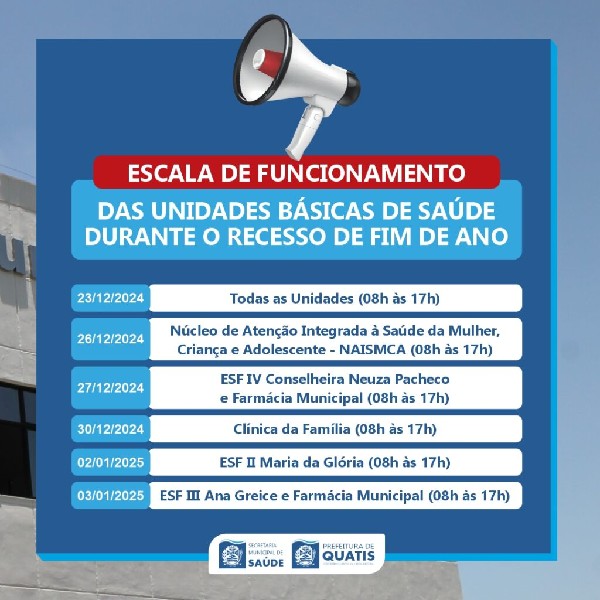 Em virtude das celebrações das festas de fim de ano, como Natal e Ano Novo, a Prefeitura de Quatis decretou ponto facultativo nas repartições públicas municipais. Dessa forma, não haverá expediente nos dias 24, 26, 27, 30 e 31 de dezembro. O recesso se estende também para os primeiros dias de janeiro de 2025, nos dias 2 e 3 do próximo mês. O expediente retorna normalmente no dia 6 de janeiro (segunda-feira).A medida não se estende aos serviços públicos considerados essenciais para a população, como serviços de limpeza e manutenção urbana, ordem pública e áreas da saúde. Por esse motivo, as Unidades de Estratégia de Saúde da Família (ESF’s) também funcionarão de forma escalonada, das 8h às 17h, durante o período de recesso. Confira:23/12 (segunda-feira) – Todas as Unidades em funcionamento;26/12 (quinta-feira) – Núcleo de Atenção Integrante à Saúde da Mulher, Criança e Adolescente – NAISMCA (antiga Casa da Criança);27/12 (sexta-feira) – ESF IV – Conselheira Neuza Pacheco (bairro Jardim Polastri) e Farmácia Municipal;30/12 (segunda-feira) – Clínica da Família (bairro Nossa Senhora do Rosário);02/01 (quinta-feira) – ESF II Maria da Glória (Mirandópolis);03/01 (sexta-feira) – ESF III Ana Greice (Jardim Independência) e Farmácia Municipal;O Decreto Municipal nº 3.348 foi publicado nesta quinta-feira (19) e já está disponível no Portal da Transparência, no site oficial da administração municipal. Para acessá-lo, basta o munícipe entrar pelo link https://quatis.aexecutivo.com.br/decretos.php?id=1590A PMQ aproveita para desejar a todos um Feliz Natal e um próspero Ano Novo! Boas Festas!