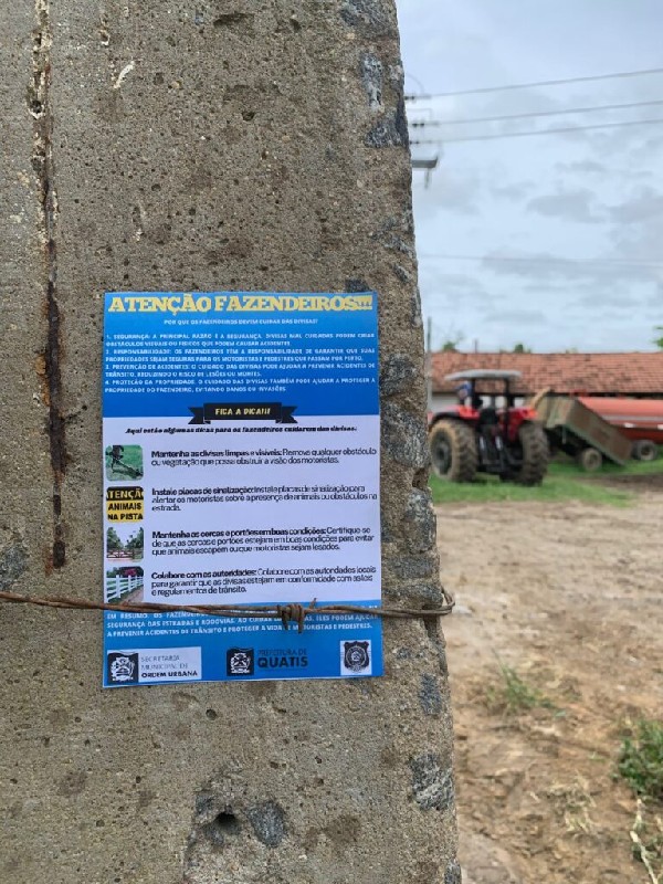 O Departamento de Educação de Trânsito (DEMUTRAN) e a Defesa Civil, da Secretaria Municipal de Ordem Urbana (SMOU) de Quatis, realizaram, recentemente, uma ação de conscientização aos proprietários rurais sobre segurança no trânsito.Com o tema “Cuidado com Animais na Pista”, o objetivo foi orientar e alertar a comunidade da zona rural sobre os cuidados com acidentes envolvendo animais nas estradas vicinais. Segundo a SMOU, acidentes de trânsito envolvendo animais vêm sendo recorrentes no município, visto que a cidade é localizada em área de mata.As consequências podem ser consideradas graves ou fatais, causando também danos materiais, multa e processos judiciais, além de lesão ou morte do animal e do condutor. Na ocasião, a equipe entregou panfletos educativos e ainda deu orientações para moradores locais sobre o assunto e o que fazer para evitar acidentes, como:Instalar e regular cercas e muros nas propriedades;Manter portões e cancelas fechados;Saber identificar animais próximos das áreas;Instalar placas de sinalização: “Atenção: Animais na Pista!”