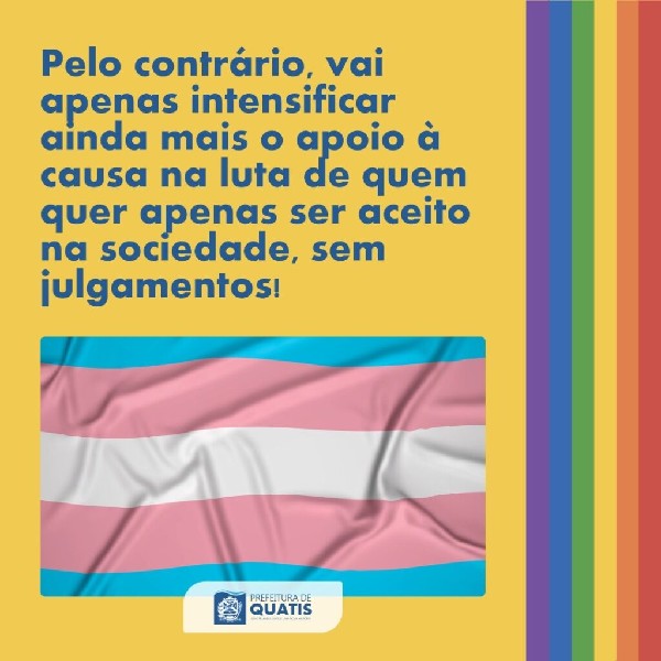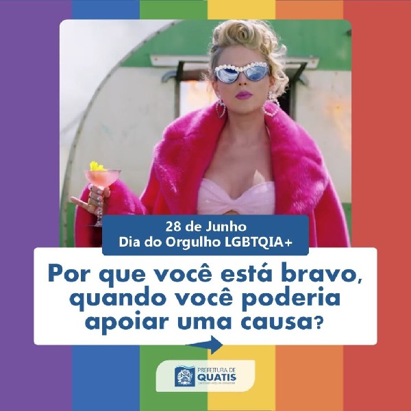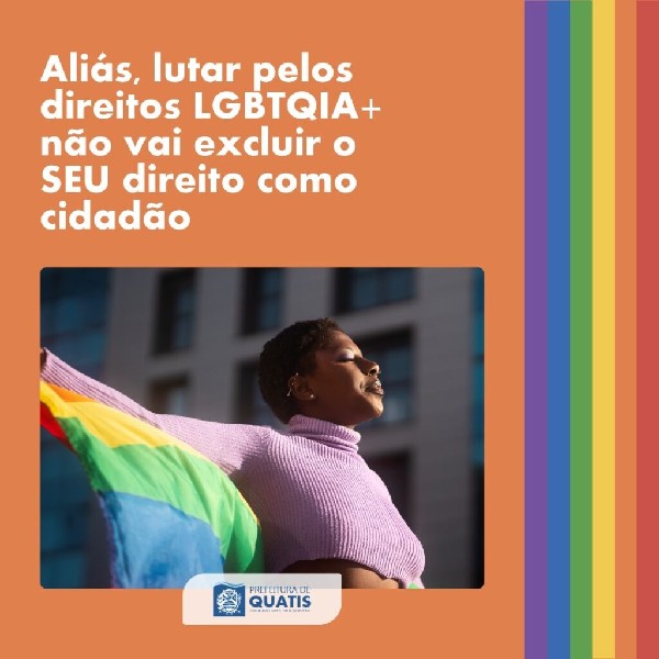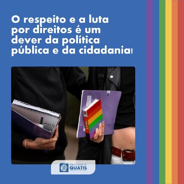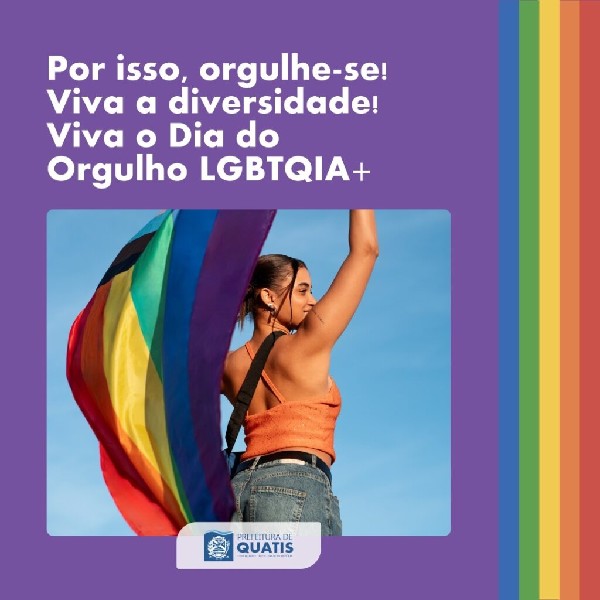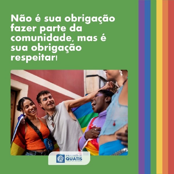Não é sua obrigação fazer parte da comunidade, mas é dever e obrigação de todos respeitar e incluir!Nesta sexta-feira, dia 28 de junho, é celebrado mundialmente o Dia do Orgulho LGBTQIA+ e a Prefeitura de Quatis novamente reafirma o compromisso de lutar pela causa, na busca por direitos de pessoas LGBTQIAPN+.Junho, que também é celebrado o Mês do Orgulho, carrega consigo as cores da bandeira para lembrar que a diversidade importa e deve ser respeitada durante o ano inteiro.É o dever de todos construir uma sociedade mais harmônica, empática, segura e sem preconceitos!Orgulhe-se da diversidade, orgulhe-se de ser quem você é! Viva o Orgulho LGBTQIA+